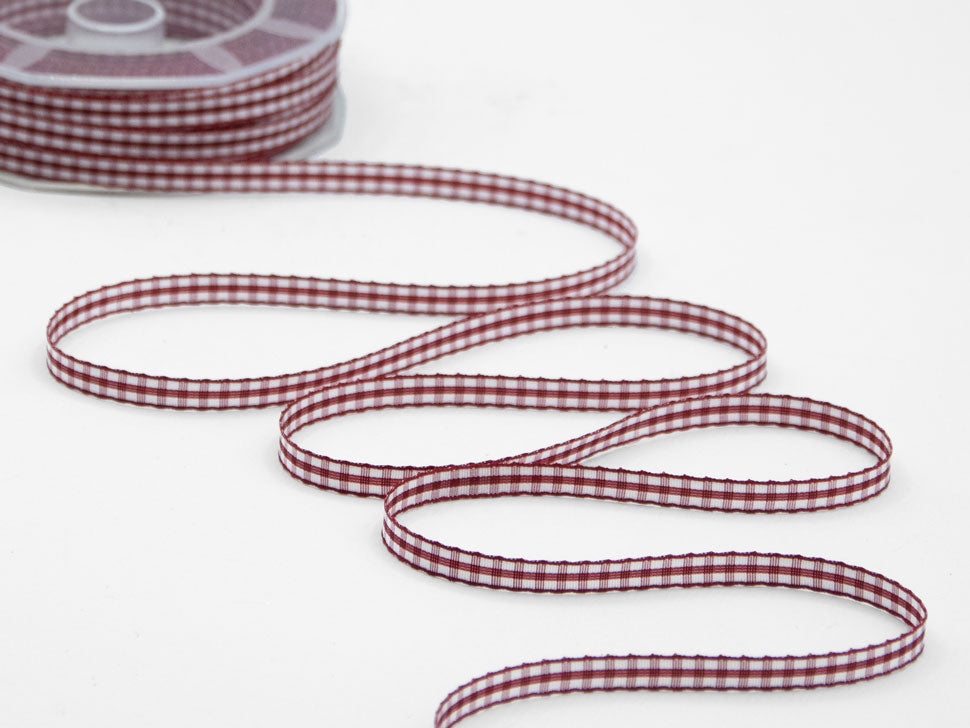 Bamby 6 MM Amaranto. Il Bamby è un nastro a quadretti, detto anche vichy, adatto agli utilizzi per le decorazioni dei bambini, come i fiocchi di nascita bimbo e bimba, oppure, negli altri colori, per confezioni country e rustiche. In questa versione è presentato con l'elastico su un bordo a formare una rouge molto comoda da applicare sui bordi. L’articolo T20/06 è un nastro con il motivo classico a quadri con bordi rifiniti più spessi Il nastro scozzese Vichy è un nastro semplice ma alla moda, facile da abbinare, può essere utilizzato con vari oggetti per creare un sapore retrò ed elegante. Il nastro T20 è realizzato con filato poliestere tinto in filo di alta qualità e ha la caratteristica di essere morbido al tatto, di non sbiadire al lavaggio e di avere un taglio netto e definito. Questo quadrettino è molto indicato per le realizzazioni dedicate ai più piccoli: dall’abbigliamento alla creazioni di bomboniere, usato invece nella variante di colore rosso il nastro Vichy è ideale per le decorazioni floreali, per la decorazione della casa, per la confezione dei pacchetti nei periodo di Natale, San Valentino e la festa della mamma. . Codice colore# 46 - CONFEZIONATO IN BOBINA DA METRI 25