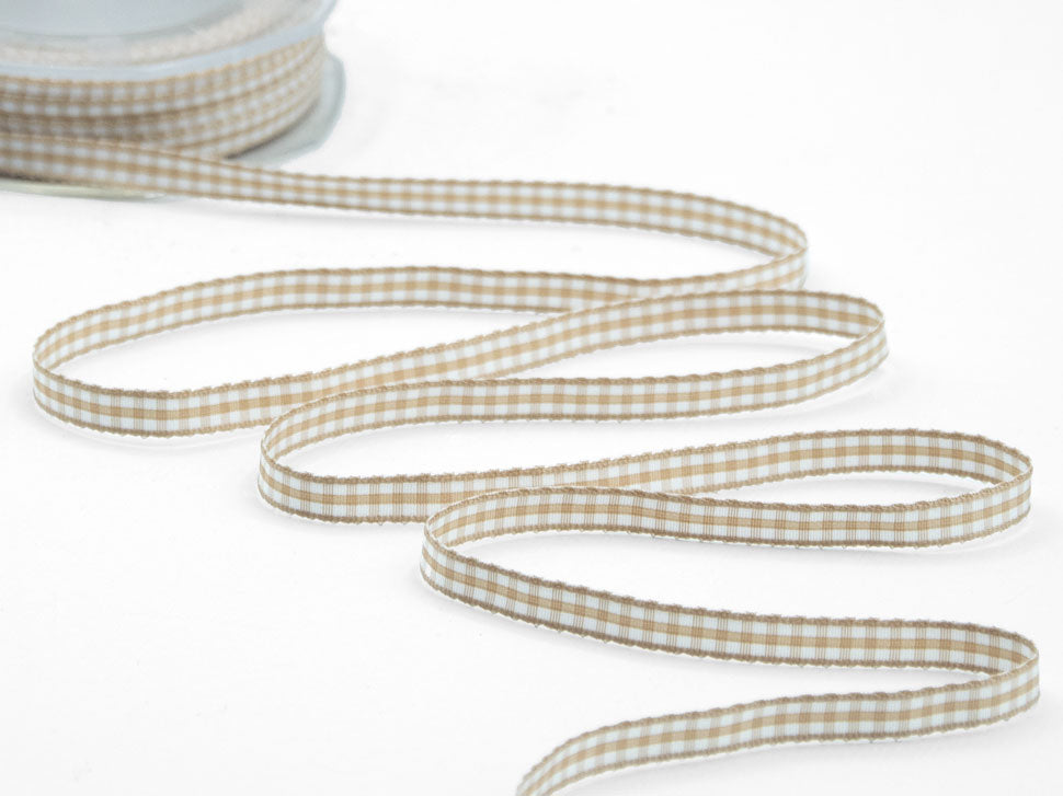 Bamby 6 MM Beige. Il Bamby è un nastro a quadretti, detto anche vichy, adatto agli utilizzi per le decorazioni dei bambini, come i fiocchi di nascita bimbo e bimba, oppure, negli altri colori, per confezioni country e rustiche. In questa versione è presentato con l'elastico su un bordo a formare una rouge molto comoda da applicare sui bordi. L’articolo T20/06 è un nastro con il motivo classico a quadri con bordi rifiniti più spessi