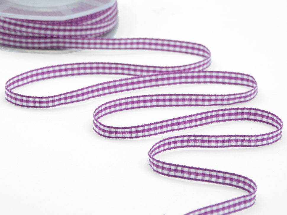 Bamby 6 MM Ciclamino Scuro. Il Bamby è un nastro a quadretti, detto anche vichy, adatto agli utilizzi per le decorazioni dei bambini, come i fiocchi di nascita bimbo e bimba, oppure, negli altri colori, per confezioni country e rustiche. In questa versione è presentato con l'elastico su un bordo a formare una rouge molto comoda da applicare sui bordi. L’articolo T20/06 è un nastro con il motivo classico a quadri con bordi rifiniti più spessi Il nastro scozzese Vichy è un nastro semplice ma alla moda, facile da abbinare, può essere utilizzato con vari oggetti per creare un sapore retrò ed elegante. Il nastro T20 è realizzato con filato poliestere tinto in filo di alta qualità e ha la caratteristica di essere morbido al tatto, di non sbiadire al lavaggio e di avere un taglio netto e definito. Questo quadrettino è molto indicato per le realizzazioni dedicate ai più piccoli: dall’abbigliamento alla creazioni di bomboniere, usato invece nella variante di colore rosso il nastro Vichy è ideale per le decorazioni floreali, per la decorazione della casa, per la confezione dei pacchetti nei periodo di Natale, San Valentino e la festa della mamma. . Codice colore# 61 - CONFEZIONATO IN BOBINA DA METRI 25