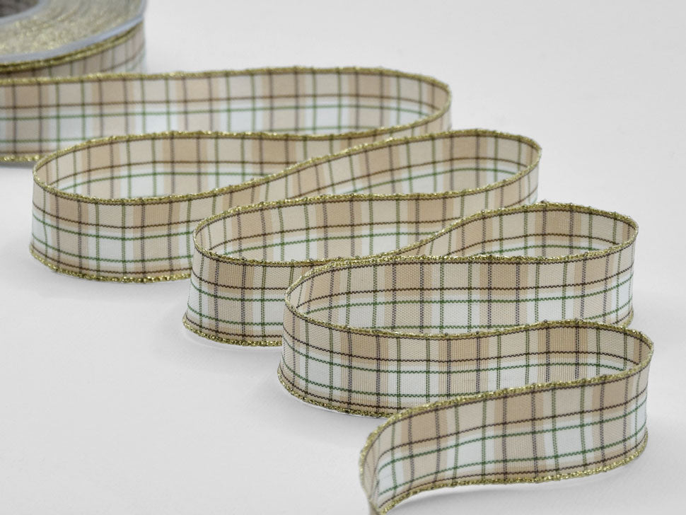 Kilt Scozzese 25 mm Beige/Verde Inglese. Il nastro Kilt Scozzese è un nastro natalizio realizzato con filato poliestere, caratterizzato da un disegno a quadretti. E’ un nastro in tartan resistente, non è animato, ma ben apprettato in modo da essere modellato a nostro piacimento. Al taglio il nastro Kilt Scozzese non si sfilaccia, quindi è ideale per creare un bel fiocco natalizio. Il nastro può essere utilizzato per creare fiocchi per una ghirlanda o per l’albero di Natale, per confezionare graziosi pacchi regalo, per decorare la nostra casa o personalizzare oggetti fatti a mano, o dovunque ci sia bisogno di portare una deliziosa atmosfera natalizia.. Codice colore# 2/633 - CONFEZIONATO IN BOBINA DA METRI 20