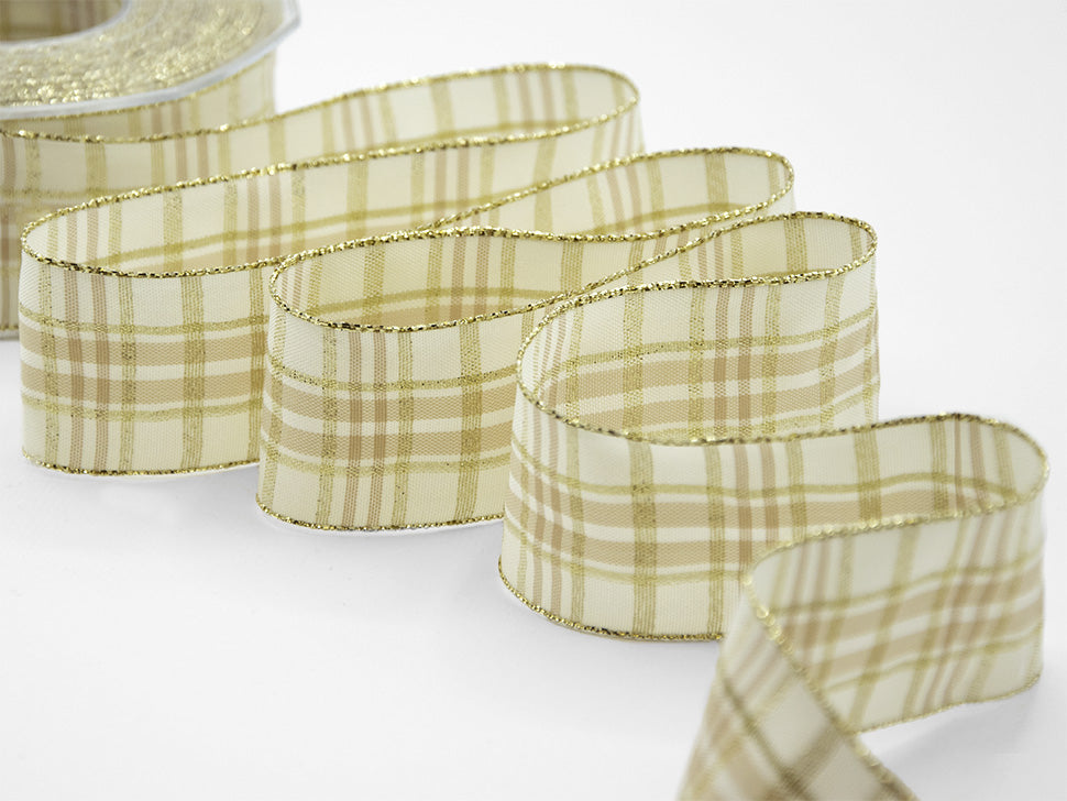 Noel 40 MM Beige. Il nastro scozzese Noel T170 è un nastro natalizio alto 40mm, realizzato con filato poliestere tinto in filo, caratterizzato da un disegno a quadretti e una bordura in lamè: oro, oppure argento. E’ un nastro in tartan resistente, non è animato, ma ben apprettato in modo da essere modellato a nostro piacimento, al taglio il Nastro Noel non si sfilaccia, quindi è ideale per creare un bel fiocco natalizio. Il nastro Noel T17/40 può essere utilizzato per creare fiocchi per una ghirlanda o per l’albero di Natale, per confezionare graziosi pacchi regalo, per decorare la nostra casa o personalizzare oggetti fatti a mano, o dovunque ci sia bisogno di portare una deliziosa atmosfera natalizia.. Codice colore# 2 - CONFEZIONATO IN BOBINA DA METRI 20