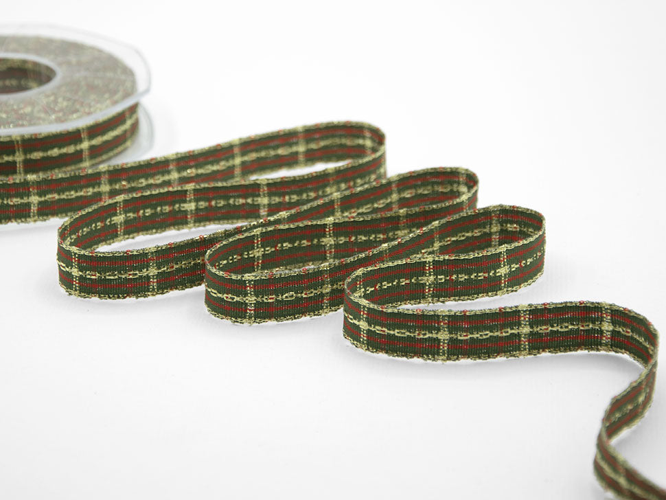 Scozzese Catenella 15 MM Verde Inglese Oro. E’ un nastro molto elegante, con colori classici, adatto in particolare ad eventi raffinati si ma nella natura, in campagna, nella casa o ristorante in mezzo al verde. Il nastro riporta alle Highlands scozzesi, alle feste di campagna dei signorotti locali, i prati verdi, le serate nel maniero quando festeggi il Natale in kilt. Un buon whisky, una buona birra e la tavola vestita con questi nastri. Nella versione lamè è festa, nella versione normale è amicizia, famiglia, calore del fuoco del caminetto o della stufa.. Codice colore# 633/O - CONFEZIONATO IN BOBINA DA METRI 20