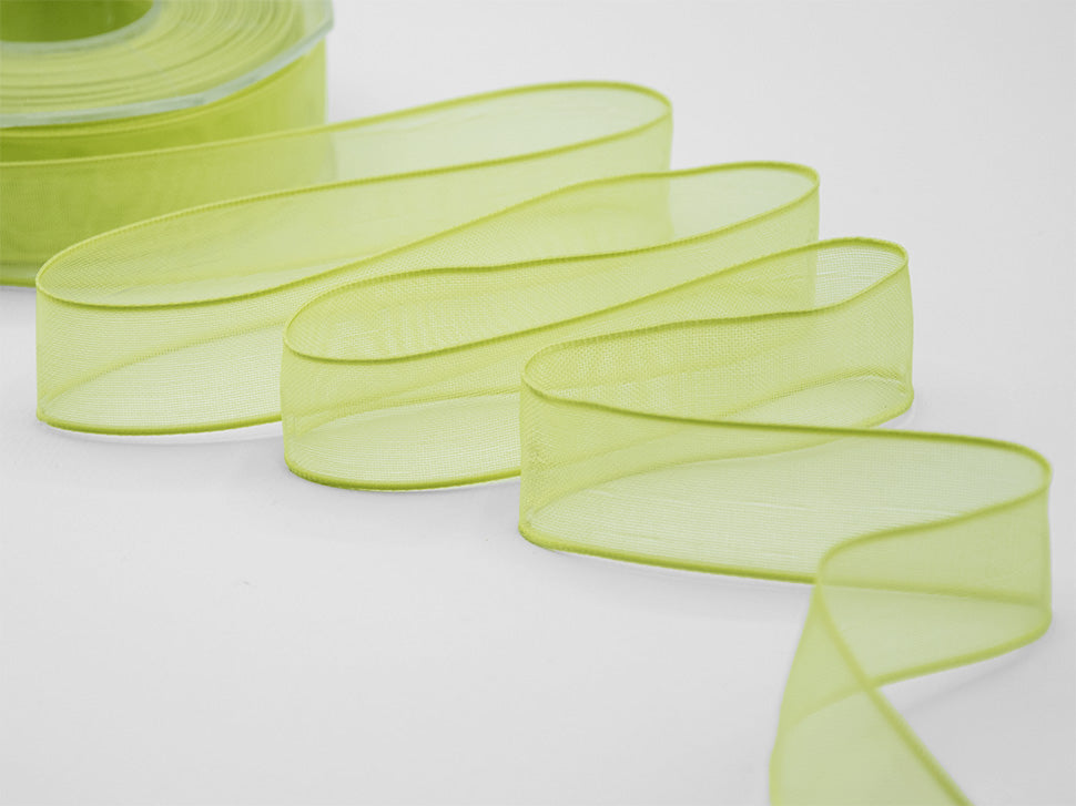 Velo Bordi Rame 15 MM Verde Acido. Il nastro velo bordi rame è un tessuto sottile e trasparente che con i suoi bordi rinforzati e lucidi permette di realizzare fiocchi ben definiti ed eleganti, con la memoria di forma.