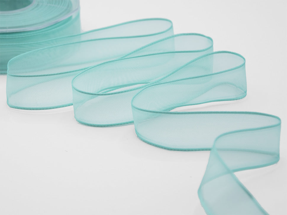 Velo Bordi Rame 15 MM Verde Acqua Marina. Il nastro velo bordi rame è un tessuto sottile e trasparente che con i suoi bordi rinforzati e lucidi permette di realizzare fiocchi ben definiti ed eleganti, con la memoria di forma. Semplice e versatile, è un nastro che, pur coprendo e nascondendo, lascia intravedere ciò che sta sotto. Ha un taglio netto e definito, che non si sfilaccia. Il suo aspetto è lievemente opaco ed è delicato al tatto. Disponibile in un’ampia gamma di colori e altezze, viene qui presentato nella tonalità tinta unita oppure nella versione stampato. È un nastro ideale per la confezione di bomboniere di matrimoni e cerimonie, per la decorazione dei fiori e della tavola, per le confezioni regalo.. Codice colore# 64 - CONFEZIONATO IN BOBINA DA METRI 25