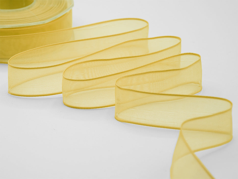 Velo Bordi Rame 40 MM Giallo Sole. Il nastro velo bordi rame è un tessuto sottile e trasparente che con i suoi bordi rinforzati e lucidi permette di realizzare fiocchi ben definiti ed eleganti, con la memoria di forma.