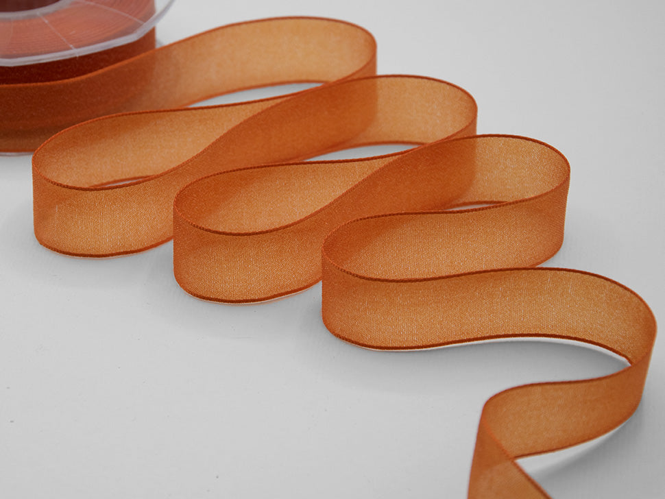 Velo Luminoso 15 MM Arancio Pesca. Il velo luminoso è un nastro dall’aspetto cangiante, iridato, luminoso, perché è tessuto con filato iridescente.