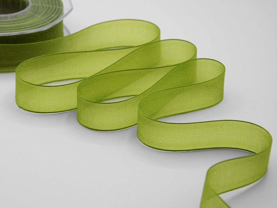 Velo Luminoso 15 MM Verde Pistacchio. Il velo luminoso è un nastro dall’aspetto cangiante, iridato, luminoso, perché è tessuto con filato iridescente.