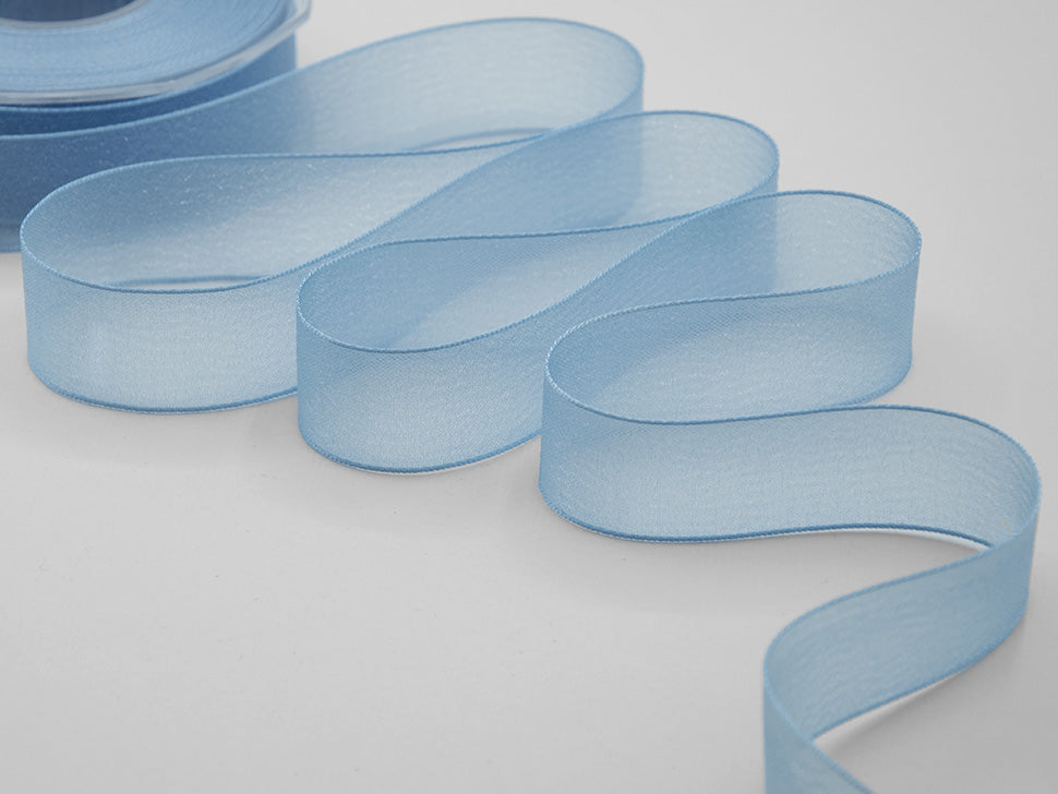 Velo Luminoso 6 MM Azzurro Baby. Il velo luminoso è un nastro dall’aspetto cangiante, iridato, luminoso, perché è tessuto con filato iridescente.