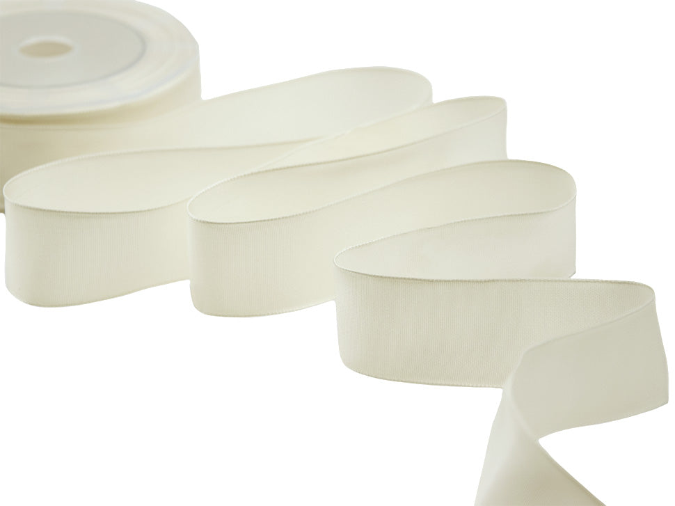 Carlotta satin copper borders 27 mm ivory. Taffeta with animated edges, Carlotta, is silky and polished. Its fabric is made up of very thin wires that give a particularly sought-after appearance and the copper edge allows you to make perfect, well modeled packaging, particularly suitable for pastry, confectionery, cake-design and all display. Color code # 35 - Packaged in a reel from 20 meters