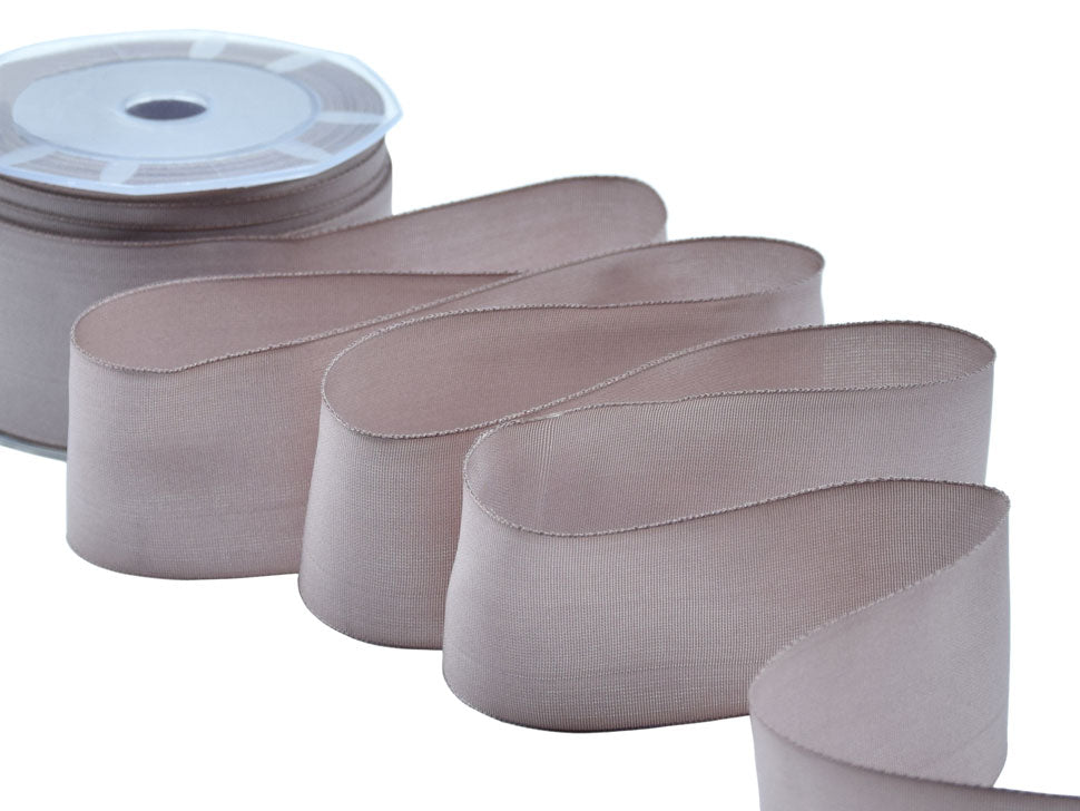 Carlotta Raso Bordi Rame 40 MM Vinaccia Chiaro. The taffeta with the animated edges, Carlotta, is silky and shiny. Its fabric is made of very thin wires that give a particularly sought-after appearance and the copper border allows to make perfect, well-shaped, partly suitable for pastry, confectionery, cake design and all the glassware. CODE OF COLOR \356; 56 -[CONFERENCE IN METER BOBINE]