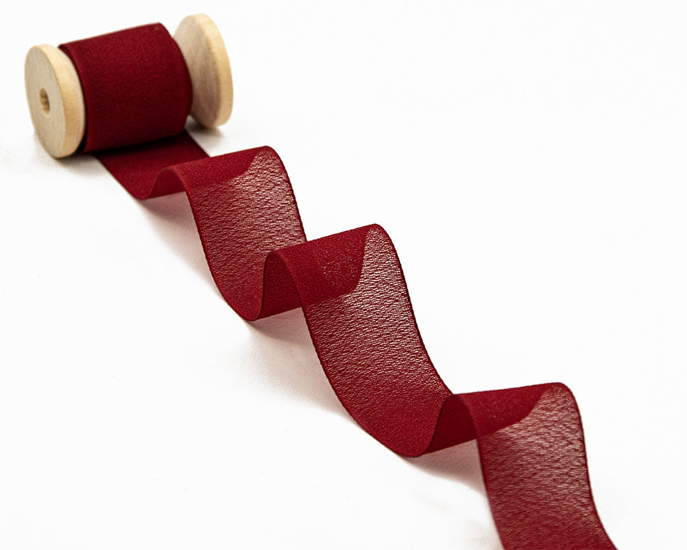 25mm Amaranth Silk-Effect Crêpe Ribbon. This chiffon ribbon has a delicate, lightweight appearance, as soft to the touch as silk. Made from 100% polyester, this high-quality ribbon features a matte, semi-transparent texture. Pair it with your floral bouquets, paper invitations, to create a unique place card, or for ultra-refined packaging. Color Code: #46 - PACKAGED IN A 25-METER SPOOL