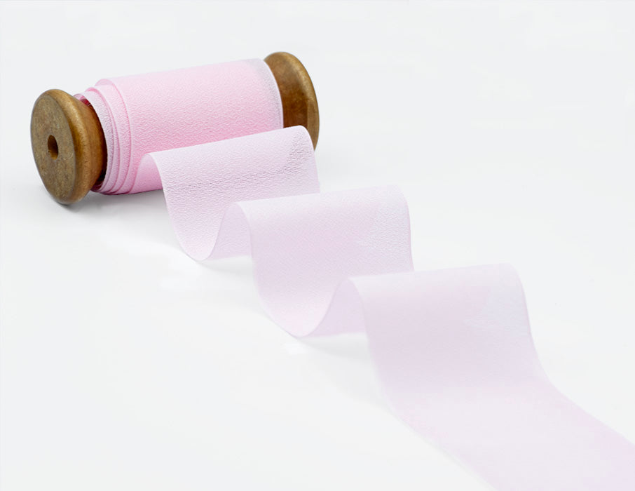 Silk-Effect Crêpe Ribbon, 48 mm, Baby Pink. This chiffon ribbon has a delicate, lightweight appearance, as soft to the touch as silk. Made from high-quality 100% polyester yarn, it features a matte, semi-transparent texture. Pair it with your floral bouquets, paper invitations, to create a unique place card, or for ultra-refined packaging. Color code #20. Packaged in a 25-meter reel.