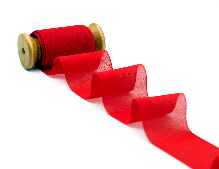 Crêpe Silk Effect Red 48 mm. The chiffon tape looks very delicate and light, soft to the touch as a silk tape. High quality because it produced in 100% polyester yarn, it is characterized by a matte and semi-transparent texture and frayed edges. Combine it to your floral bouquets, your paper invitations, to create an original placeholder or for an ultra refined packaging. Color code # 31 - Packaged in a reel from 25 meters
