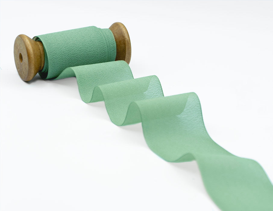 Crêpe Silk Effect Green Sea 48mm. The chiffon tape looks very delicate and light, soft to the touch as a silk tape. High quality because it produced in 100% polyester yarn, is characterized by a matte and semi-transparent texture. Combine it to your floral bouquets, your paper invitations, to create an original placeholder or for an ultra refined packaging. Color code # 9 - Packaged in a reel from 25 meters