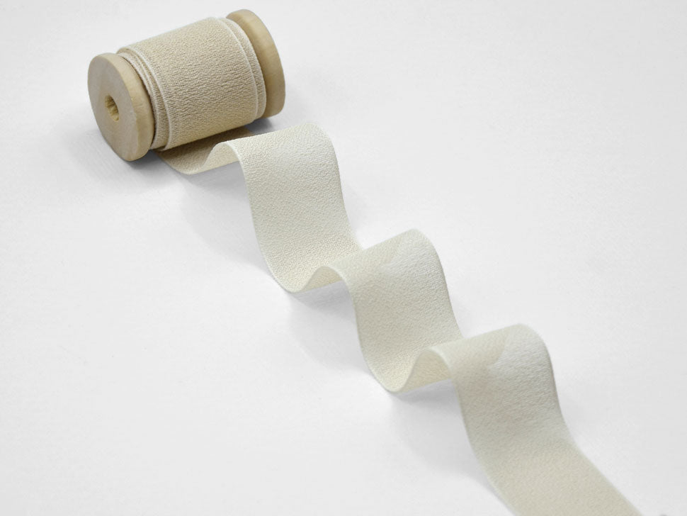 Crêpe Silk Effect Ivory 25 mm. The chiffon tape looks very delicate and light, soft to the touch as a silk tape. High quality because it produced in 100% polyester yarn, is characterized by a matte and semi-transparent texture. Combine it to your floral bouquets, your paper invitations, to create an original placeholder or for an ultra refined packaging. Color code # 35 - Packaged in a reel from 25 meters