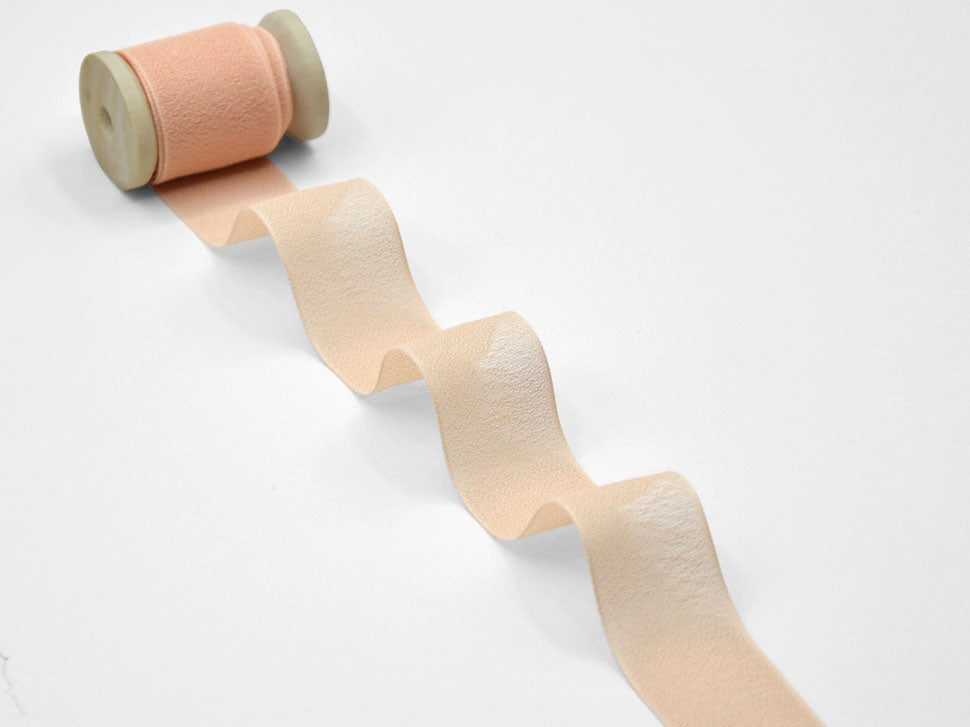Crêpe Silk Effect Pale Apricot 25mm. The chiffon tape looks very delicate and light, soft to the touch as a silk tape. High quality because it produced in 100% polyester yarn, is characterized by a matte and semi-transparent texture. Combine it to your floral bouquets, your paper invitations, to create an original placeholder or for an ultra refined packaging. Color code # 121 - packaged in a reel from 25 meters