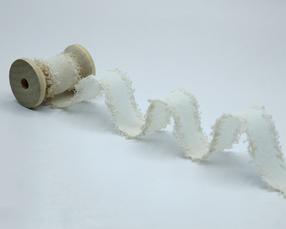 Ivory Fringed Silk-Effect Crêpe Ribbon, 25mm. This chiffon ribbon has a delicate, lightweight appearance, as soft to the touch as silk. Made from 100% polyester, this high-quality ribbon features a matte, semi-sheer texture and frayed edges. Pair it with your floral bouquets, paper invitations, to create a unique place card, or for ultra-refined packaging. Color Code #35 - PACKAGED IN A 25-METER SPOOL