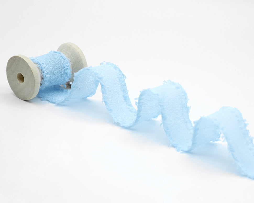 Baby Blue Fringed Silk-Effect Crêpe Ribbon, 25mm. This chiffon ribbon has a delicate, lightweight appearance, as soft to the touch as silk. Made from 100% polyester, this high-quality ribbon features a matte, semi-sheer texture and frayed edges. Pair it with your floral bouquets, paper invitations, to create a unique place card, or for ultra-refined packaging. Color code #593 - PACKAGED IN A 25-METER ROLL