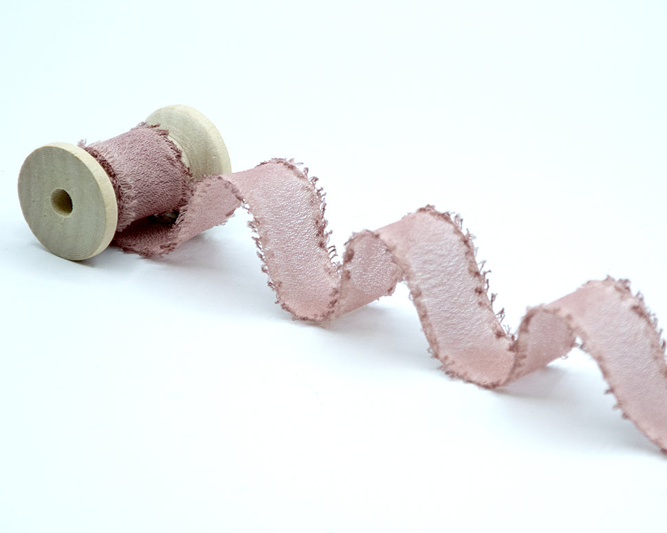 Silk-Effect Fringed Crepe in Dark Powder Pink, 25mm. This chiffon ribbon has a delicate, lightweight appearance, as soft to the touch as silk. Made from high-quality 100% polyester yarn, it features a matte, semi-sheer texture and frayed edges. Pair it with your floral bouquets, paper invitations, to create a unique place card, or for ultra-refined packaging. Color code #552 - PACKAGED IN A 25-METER REEL