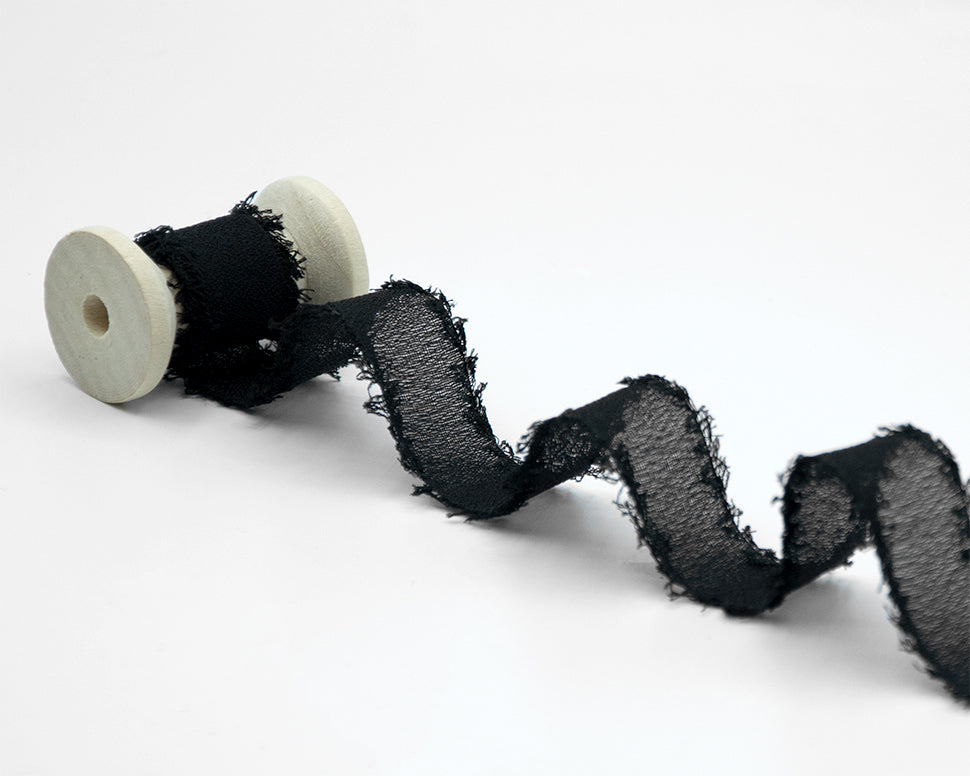 Black Fringed Silk-Effect Crêpe Ribbon, 25mm. This chiffon ribbon has a delicate, lightweight appearance, as soft to the touch as silk. Made from high-quality 100% polyester yarn, it features a matte, semi-sheer texture and frayed edges. Pair it with your floral bouquets, paper invitations, to create a unique place card, or for ultra-refined packaging. Color code #33 - PACKAGED IN A 25-METER ROLL