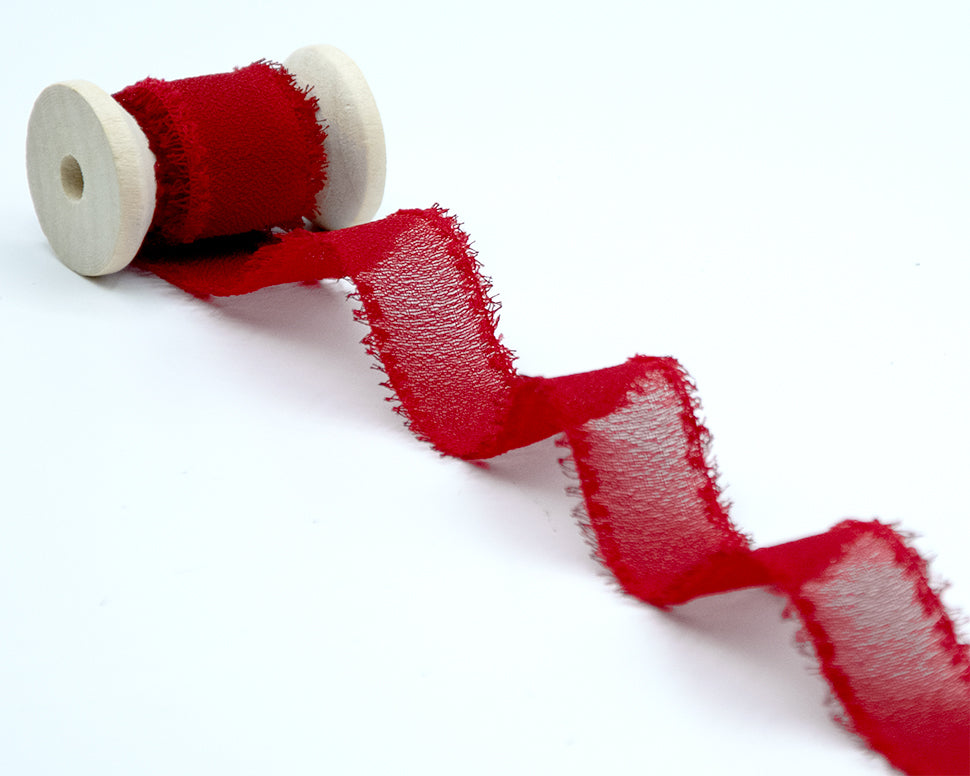 Red Fringed Silk-Effect Crêpe Ribbon, 25mm. This chiffon ribbon has a delicate, lightweight appearance, as soft to the touch as silk. Made from 100% polyester, this high-quality ribbon features a matte, semi-sheer texture and frayed edges. Pair it with your floral bouquets, paper invitations, to create a unique place card, or for ultra-refined packaging. Color Code #31 - PACKAGED IN A 25-METER SPOOL
