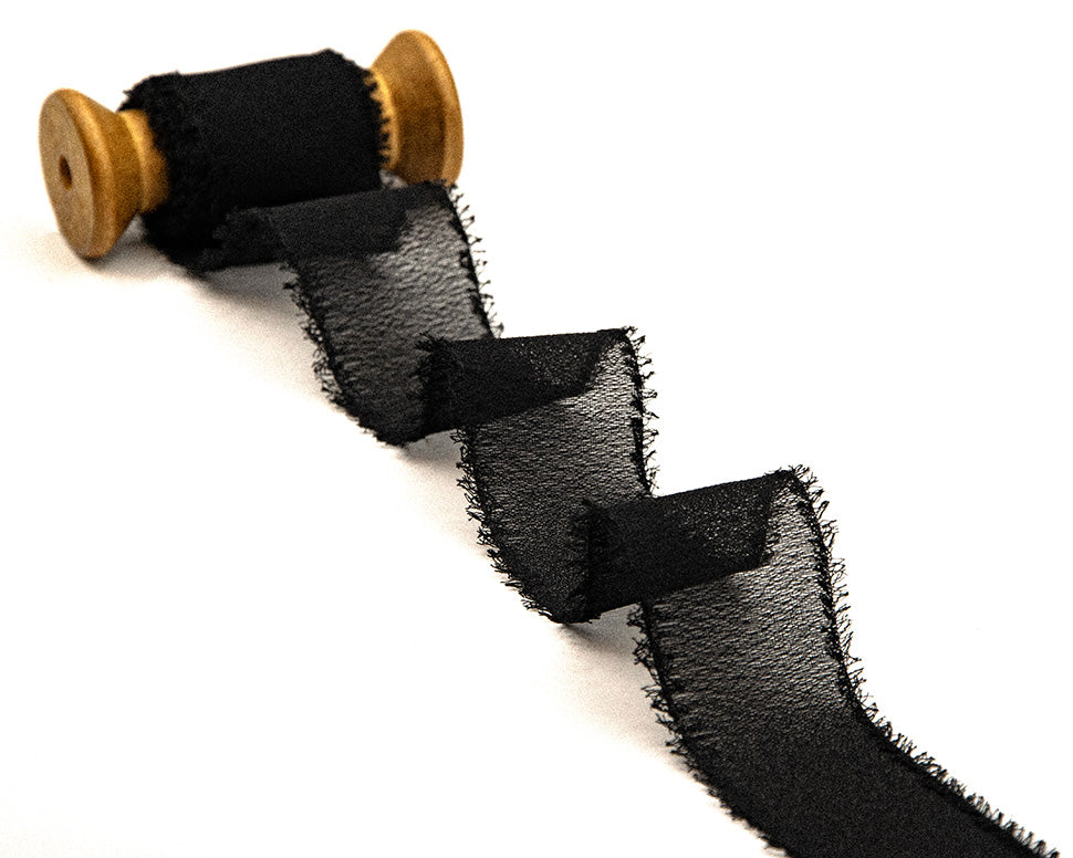 Black Fringed Silk-Effect Crêpe Ribbon, 40mm. This chiffon ribbon has a delicate, lightweight appearance, soft to the touch like silk. Made from 100% polyester, this high-quality ribbon features a matte, semi-sheer texture and frayed edges. Pair it with your floral bouquets, paper invitations, to create a unique place card, or for ultra-refined packaging. Color Code #33 - PACKAGED IN A 25-METER ROLL