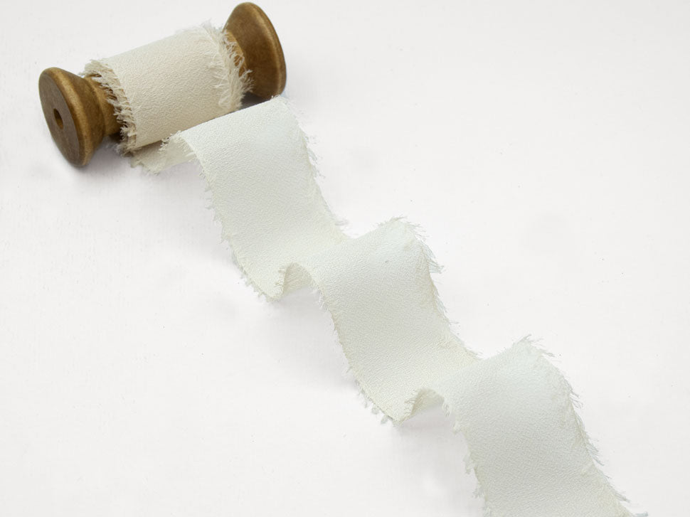Crêpe Silk Effect Fringed Ivory 40 mm. The chiffon tape looks very delicate and light, soft to the touch as a silk tape. High quality because it produced in 100% polyester yarn, it is characterized by a matte and semi-transparent texture and frayed edges. Combine it to your floral bouquets, your paper invitations, to create an original placeholder or for an ultra refined packaging. Color code # 35- Packaged in a reel from 25 meters