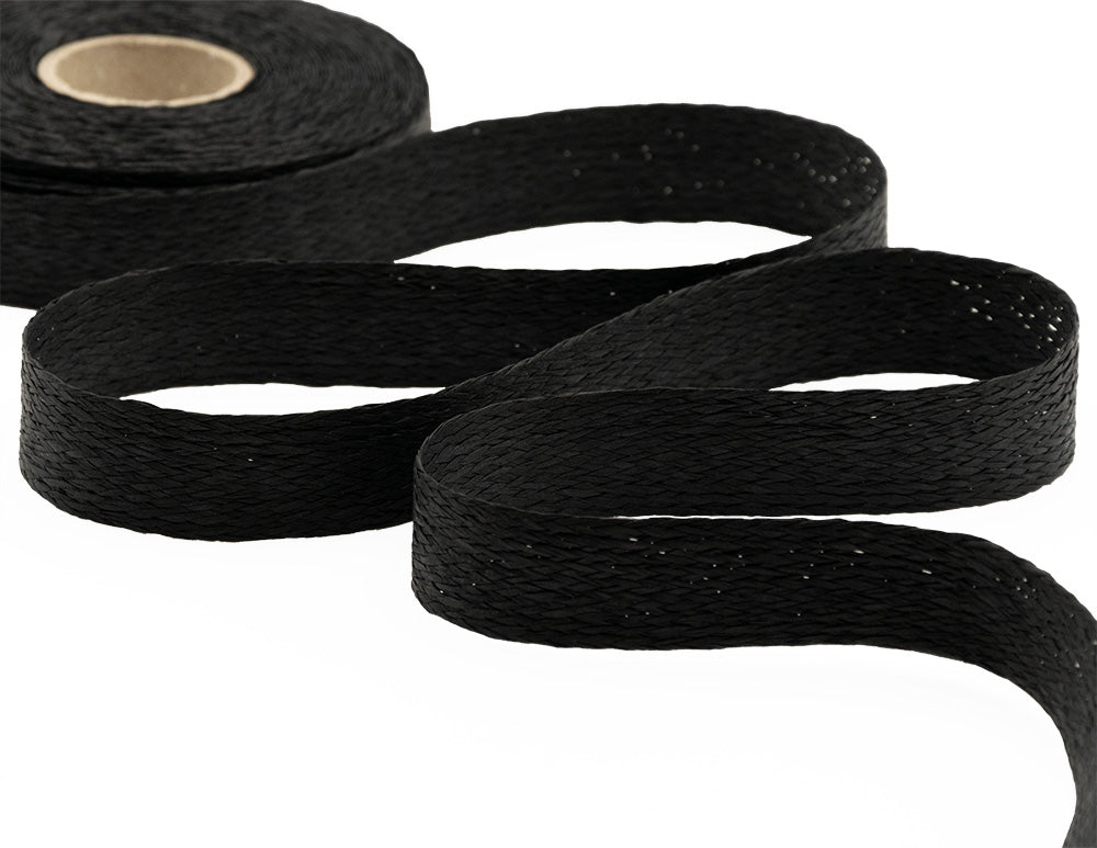 25mm Black Woven Paper Ribbon. This woven paper ribbon is ideal for wrapping gifts and floral arrangements. 100% green. It can be used as a simple ribbon or stretched to create a net. The textured feel of the paper gives the ribbon a particularly natural feel. Our paper ribbons and cords are eco-friendly products as they can be completely wrapped in paper. Color code #33. Packaged in 10-meter reels.