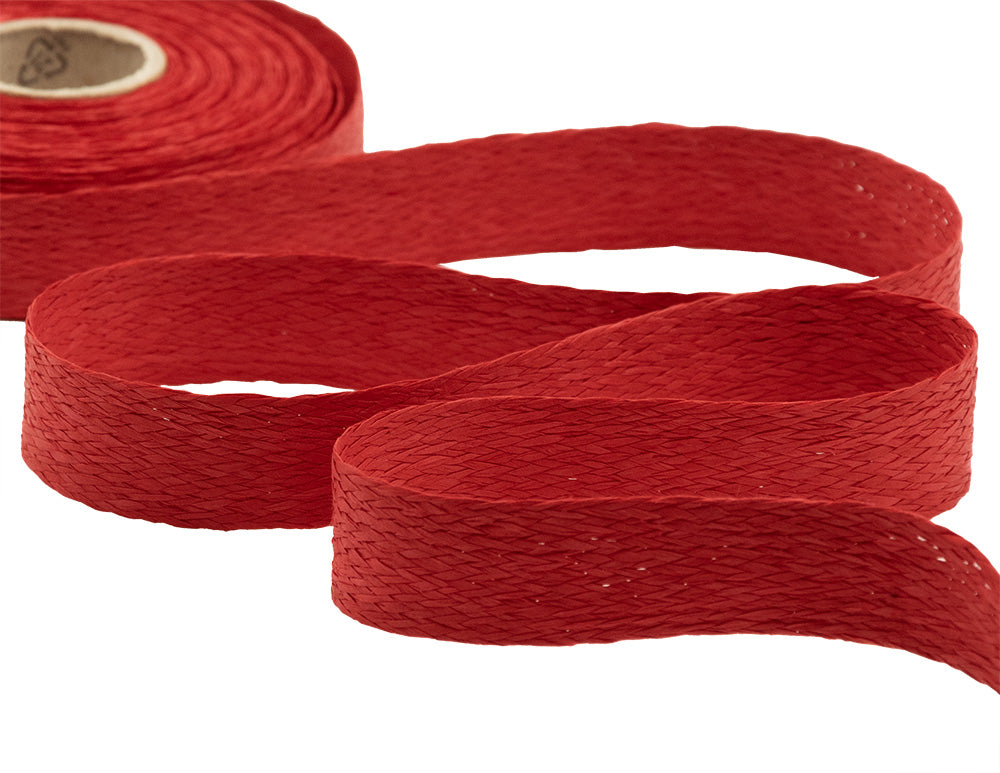 25mm Red Woven Paper Ribbon. This woven paper ribbon is ideal for wrapping gifts and floral arrangements. 100% green. It can be used as a simple ribbon or stretched to create a net. The textured feel of the paper gives the ribbon a particularly natural feel. Our paper ribbons and cords are eco-friendly products as they can be completely wrapped in paper. Color code #31. Packaged in 10-meter reels.