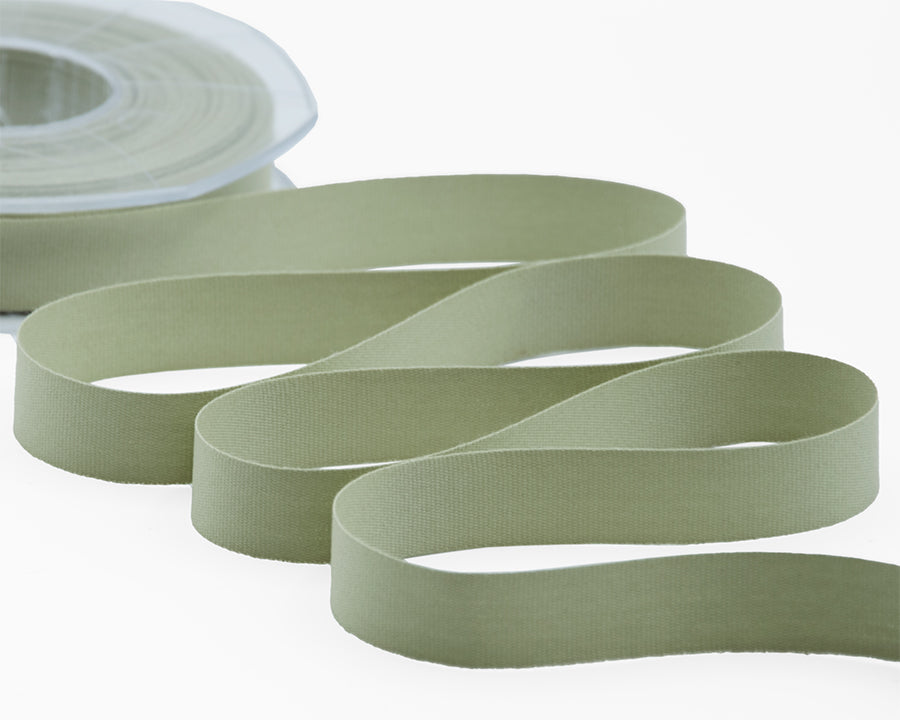 15mm Sage Green Cotton Ribbon. This ribbon is made from 100% cotton yarn.With an extremely natural look, this ribbon can be used to decorate eco-friendly or plastic-free packaging. Color code #15. Packaged in a 20-meter reel.