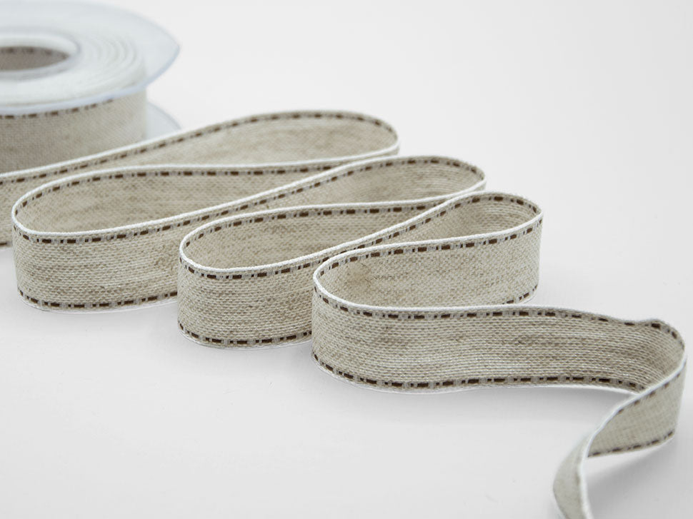 Flax Tape Hemp Stitching26 MM Brown. It is a very precious ribbon, in linen, hemp and viscose, synonymous with nature, reminiscent of the canvases of the past. It looks rough, but it's not, it's very easy to work with. It has a hazelnut color, classic and simple. With a rustic appearance, it is actually very elegant and combines the ancient with the modern, the natural tradition with the most refined elegance. It is the ideal complement for handicrafts and can be used very well even in the most elegant ceremonies. This tape conveys warmth and simplicity. Linen and hemp ribbons also exist in the version with stitching, they are very characteristic thanks to their natural colors and their rustic and elegant appearance, perfect to give a chic and natural effect to any type of decoration. Just play with the imagination and use these cloth ribbons for the realization of various DIY and craft projects; they are perfect for the Christmas theme, rustic, country, vintage and shabby and for the creation of favors: baptism, communion, confirmation, graduation, marriage, eighteenth, engagement. Products with high quality material. Color Code# 44 - PACKED IN 10 METER COIL