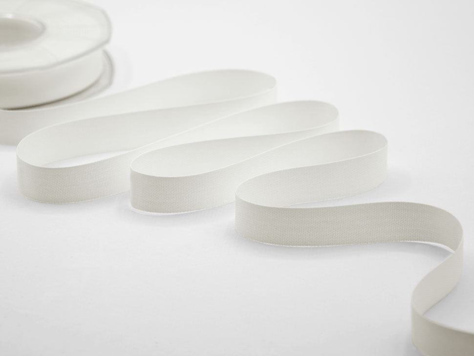 Poly Cotton 15 MM Natural White. Polycotton and natural-looking ribbons are in line with green trends to create packages and decorations with a rustic or raw effect. Highly appreciated for its characteristics are cotton polyester ribbons. Opaque, natural-looking, it is pleasant to the touch because it is soft and warm, looks slightly sweaty. It is easily worked and used more and more often for the creation of luxury gift boxes, shopper handles, wedding favor creations, Christmas decorations, floral decorations and food packaging. Also appreciated by important fashion brands it has been chosen for the customization of their logo tape. Like all our tapes it is bored very easily and does not fray at the cut. Cotton-type fabric tape is produced in a wide range of colors and heights.. Color Code# 1 - PACKED IN 25 METER COIL