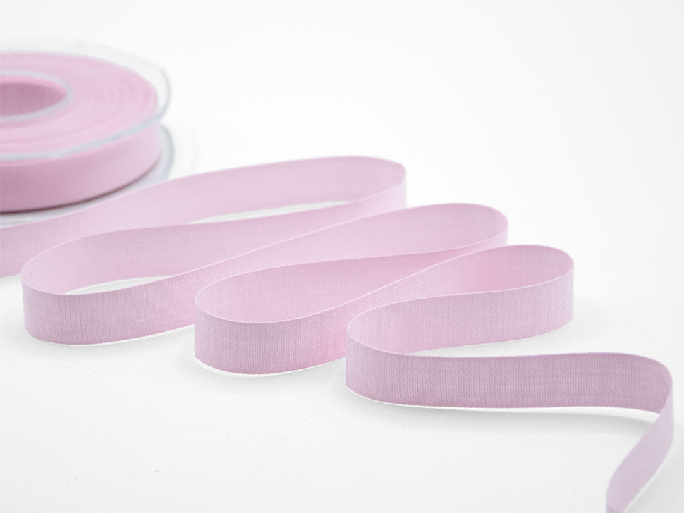 Poly Cotton 15 MM Pink Baby. Polycotton and natural-looking ribbons are in line with green trends to create packages and decorations with a rustic or raw effect. Highly appreciated for its characteristics are cotton polyester ribbons. Opaque, natural-looking, it is pleasant to the touch because it is soft and warm, looks slightly sweaty. It is easily worked and used more and more often for the creation of luxury gift boxes, shopper handles, wedding favor creations, Christmas decorations, floral decorations and food packaging. Also appreciated by important fashion brands it has been chosen for the customization of their logo tape. Like all our tapes it is bored very easily and does not fray at the cut. Cotton-type fabric tape is produced in a wide range of colors and heights.. Color Code# 20 - PACKED IN 25 METER COIL