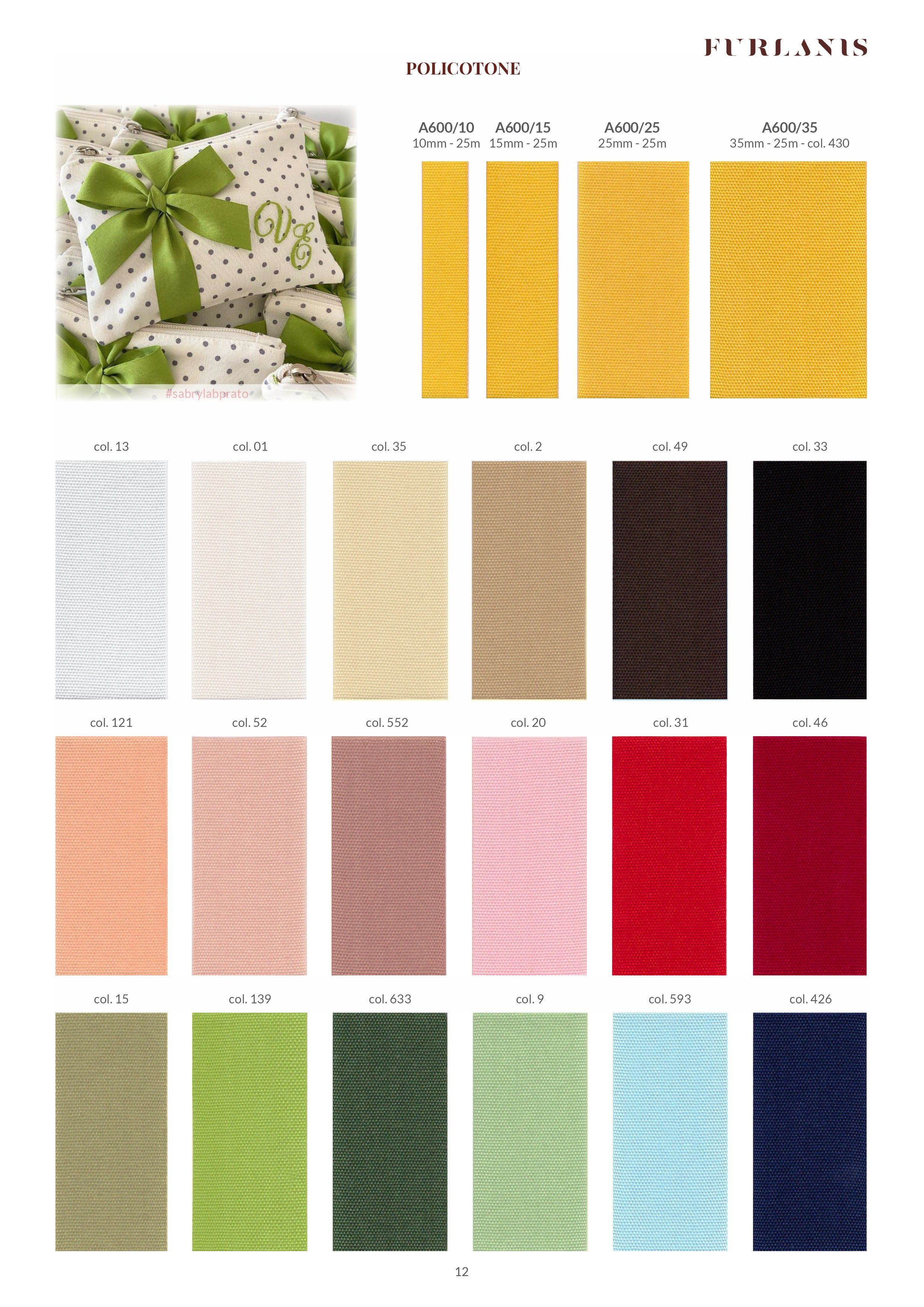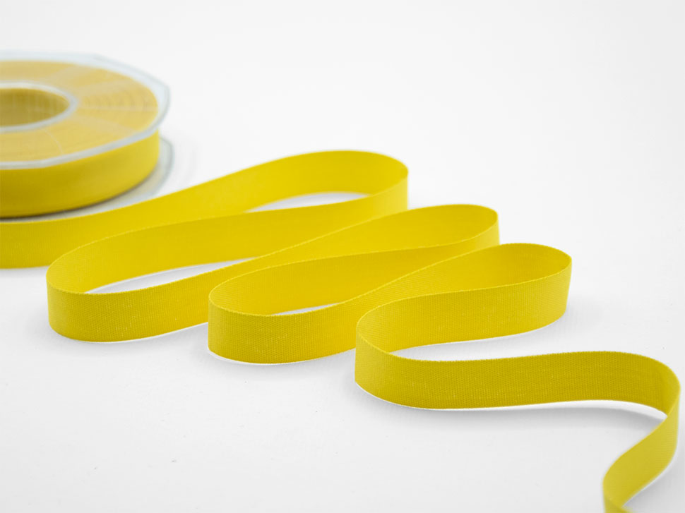 Poly Cotton 15 MM Sulphur. Polytone and natural-looking tapes are in line with the green trends to make rustic or raw packaging and decorations. Much appreciated for its characteristics are cotton polyester ribbons. Opaque, from the natural aspect, is pleasant to the touch because it is soft and warm, looks slightly felled. It is easy to work and is used more and more often for the creation of luxury gift packages, for shopping handles, for the creation of candy, for Christmas decorations, for floral decorations and for food packaging. Also appreciated by important fashion brands has been chosen for customizing their tape with logo. Like all our tapes, it is very easily bored and does not wear out when cut. Cotton-type fabric tape is produced in a wide range of colours and heights. CODE OF COLOR \350; 430 -[CONFERENCE IN METER BOBINE]