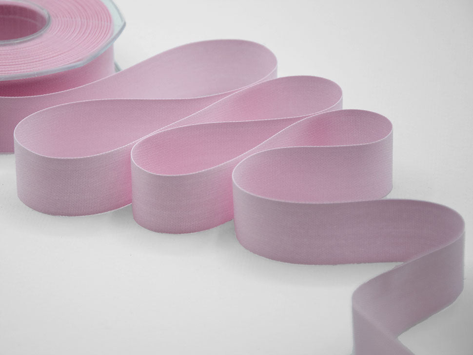 Poly Cotton 25 MM Pink Baby. Polycotton and natural-looking ribbons are in line with green trends to create packages and decorations with a rustic or raw effect. Highly appreciated for its characteristics are cotton polyester ribbons. Opaque, natural-looking, it is pleasant to the touch because it is soft and warm, looks slightly sweaty. It is easily worked and used more and more often for the creation of luxury gift boxes, shopper handles, wedding favor creations, Christmas decorations, floral decorations and food packaging. Also appreciated by important fashion brands it has been chosen for the customization of their logo tape. Like all our tapes it is bored very easily and does not fray at the cut. Cotton-type fabric tape is produced in a wide range of colors and heights.. Color Code# 20 - PACKED IN 25 METER COIL