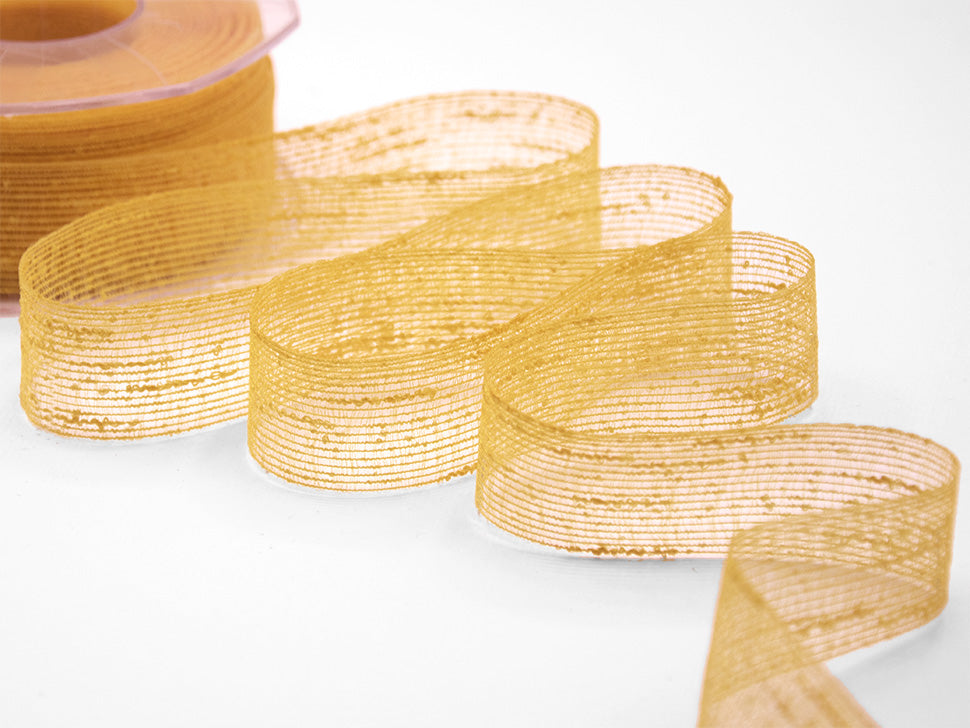 Veil 14 MM Sun Yellow. The veil tape is a rustic and transparent tape, woven with bouclé yarn which, while covering and hiding, lets you glimpse what is underneath. Item N27 is made up of irregular threads with curls that protrude with a buttonhole effect. The veil ribbon thus takes on an irregular, simple, rough appearance and is characterized by small knots of variable size on the surface. This rustic ribbon is suitable for original DIY creations, both in casual and contemporary style, such as decorating and beautifying the house or garden or for the creations of splendid home made favors suitable for any ceremony and occasion. . Color code # 1006 - PACKED IN 25 METERS REEL