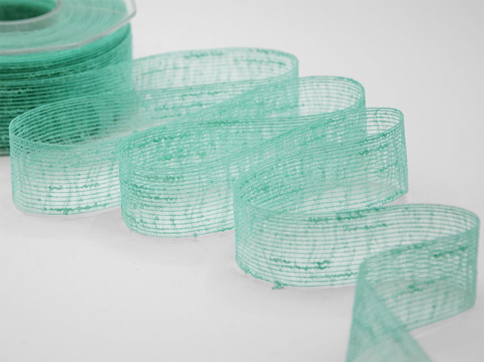 Veil 28 mm Aquamarine. The veil ribbon is a rustic and transparent ribbon, woven with bouclè yarn that, while covering and hiding, gives a glimpse of what is below. Article N27 consists of irregular threads with curls protruding with a halo effect. The sail belt thus takes on an irregular, simple, raw appearance and is characterized by small knots of varying size on the surface. This rustic ribbon is suitable for original DIY creations, both in casual and contemporary style, such as decorating and embellishing the house or garden or the creations of beautiful home made favors suitable for every ceremony and anniversary. . Color Code# 64 - PACKED IN 25 METER COIL