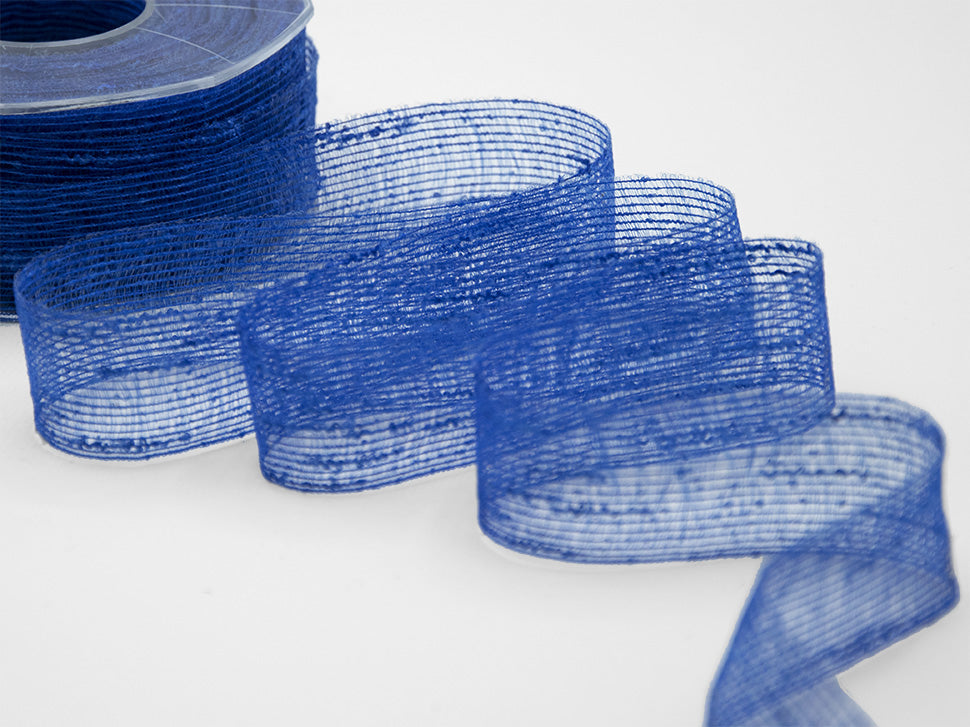 Sail 40 MM China Blue. The veil ribbon is a rustic and transparent ribbon, woven with bouclè yarn that, while covering and hiding, gives a glimpse of what is below. Article N27 consists of irregular threads with curls protruding with a halo effect. The sail belt thus takes on an irregular, simple, raw appearance and is characterized by small knots of varying size on the surface. This rustic ribbon is suitable for original DIY creations, both in casual and contemporary style, such as decorating and embellishing the house or garden or the creations of beautiful home made favors suitable for every ceremony and anniversary. . Color Code# 654 - PACKED IN 25 METER COIL