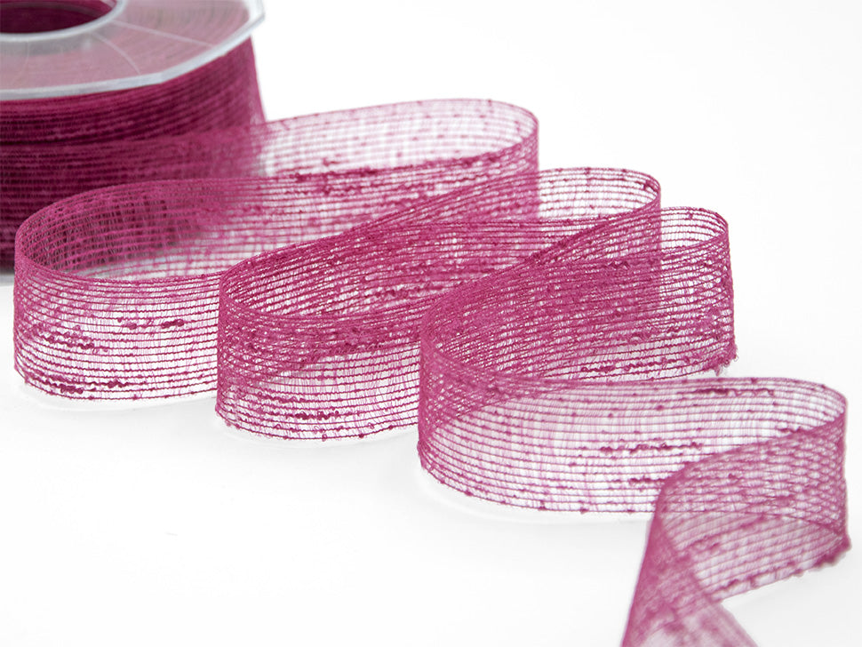 Veil 40 MM Cyclamen. The veletta ribbon is a rustic and transparent ribbon, woven with bouclé yarn which, while covering and hiding, lets you glimpse what lies beneath. Item N27 is made up of irregular threads with curls that protrude with a buttonhole effect. The veil ribbon thus takes on an irregular, simple, rough appearance and is characterized by small knots of variable size on the surface. This rustic ribbon is suitable for original DIY creations, both in casual and contemporary style, such as decorating and beautifying the house or garden or for the creations of splendid home made favors suitable for any ceremony and occasion. . Color code # 68 - PACKAGED IN 25 METERS REEL
