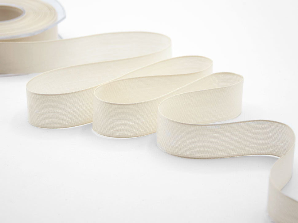Cotton Veil 25 MM Ivory. Opaque and transparent fabric like a light cotton, with edges animated by a metallic thread to give more support to your bows. Color code # 35 - PACKAGED IN 25 METERS REEL
