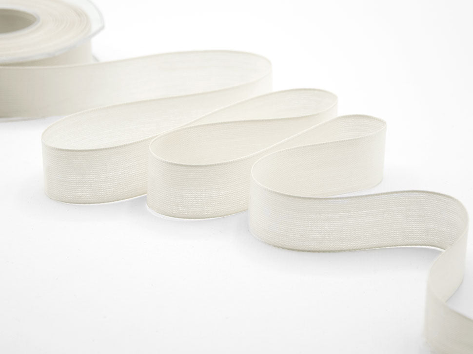 Cotton Veil 25 MM Natural White. Opaque and transparent fabric like a light cotton, with edges animated by a metallic thread to give more support to your bows. Color code # 1 - PACKAGED IN 25 METERS REEL