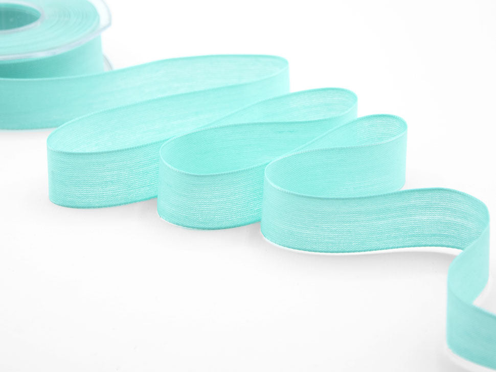 Resinated Cotton Veil 25 mm Aquamarine. Matte and transparent fabric like light cotton, with edges animated by a metal thread to give more support to your bows. Color Code# 64 - PACKED IN 25 METER COIL