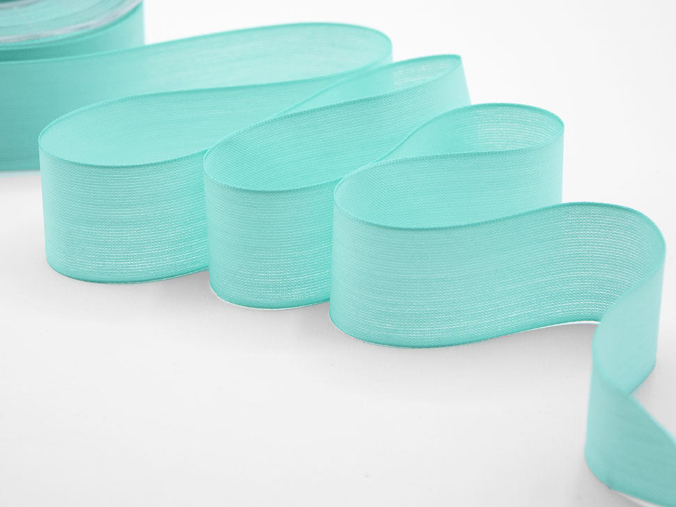 Resinated Cotton Veil 40 mm Aquamarine. Opaque and transparent fabric like a light cotton, with edges animated by a metallic thread to give more support to your bows. Color code # 64 - PACKAGED IN 25 METERS REEL