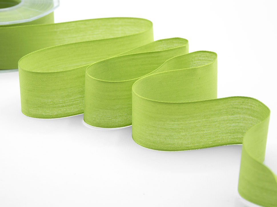 Veil Resin cotton 40 MM Pistachio Green. Matte and transparent fabric like light cotton, with edges animated by a metal thread to give more support to your bows. Color Code# 139 - PACKED IN 25 METER COIL