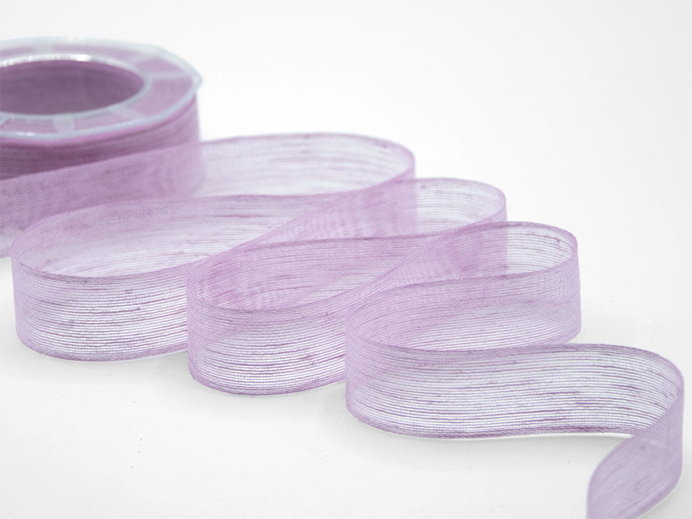 Linen Veil 24 MM Lilac Pink. It is a very fine linen ribbon, synonymous with nature, reminiscent of lavender crops. It is very easy to work with. It has a warm, classic and simple color range and is slightly transparent. With a rustic appearance, it is actually very elegant and combines the ancient with the modern, the natural tradition with the most refined elegance. It is the ideal complement for handcrafted products and can also be used very well in the most elegant ceremonies for which a lamé version is also available. This tape conveys warmth and simplicity. The natural linen ribbons are very characteristic thanks to their natural colors and their rustic and elegant appearance, perfect for giving a chic and natural effect to any type of decoration. Just play with your imagination and use these straps for the realization of various DIY and craft projects; they are perfect for the rustic, country, vintage and shabby theme and for making favors: baptism, communion, confirmation, graduation, wedding, eighteenth, engagement. Products with high quality material. Color code # 70 - PACKED IN 15 METERS REEL