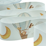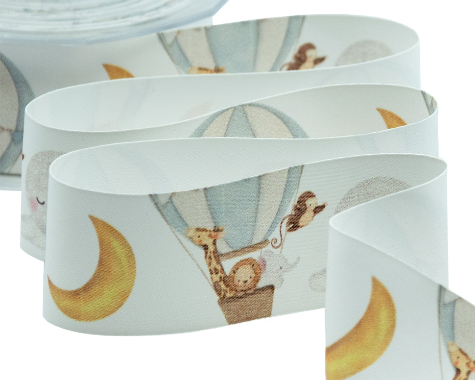Silk Satin 40 mm Balloon Zoo Print Blue . Silk satin is a very delicate ribbon, suitable for all types of wrapping. Thanks to its lightness and silkiness, it can be used to create wedding favors and decorations for elegant ceremonies and events. The smooth selvedges and matte texture give the ribbon extreme softness, making it easy to work with and suitable for creating bows and trims. Shown here in a digitally printed version.Color code #24H124 - PACKAGED IN 15-METER REELS