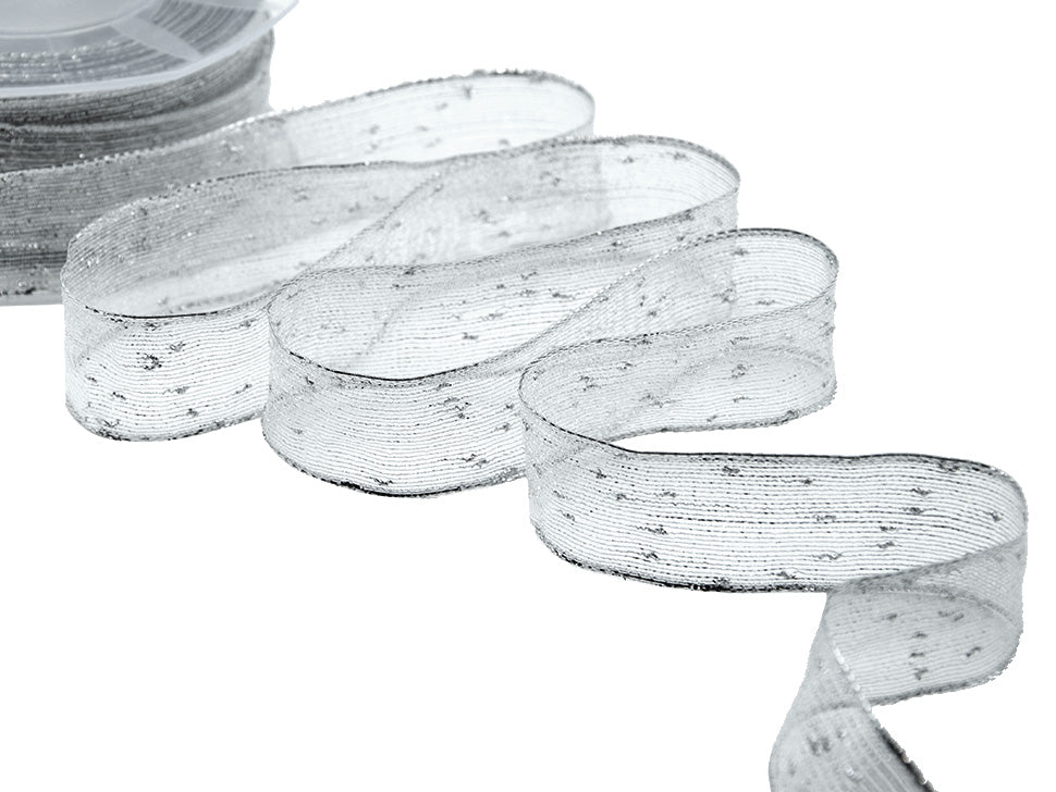 Veil Gold Silver 20 MM Silver. The veletta ribbon is a rustic and transparent ribbon, woven with bouclé yarn which, while covering and hiding, lets you glimpse what lies beneath.