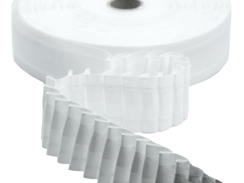 Les tringles à rideaux sont l'accessoire idéal et indispensable pour donner une touche spéciale à tout type de rideau, il est donc essentiel de choisir le bon ruban. Il existe de nombreux modèles sur le marché, tous avec la même fonction et la même méthode d'application mais chacun adapté à la création d'un type de boucle différent. La sangle la plus courante a des poches pour que les crochets et les cordes s'enroulent automatiquement et régulièrement, de plus il est possible d'insérer les crochets dans les poches dans plusieurs positions. C'est un ruban en polyester, il ressemble à un ruban avec des poches où vous pouvez insérer les crochets spéciaux pour proboscis et a deux fils à tirer pour le curling. Facile à coudre, parfait pour créer des rideaux design dans n'importe quelle pièce de la maison, il peut être utilisé sur tous types de tissus légers, moyens et épais. Pour obtenir la boucle sur le rideau, il suffit d'étaler et de coudre le ruban sur le bord supérieur du rideau, le rapport de propagation à bouclé est de 2: 1, soit deux mètres de rideau tendu couvrant un mètre de fenêtre après le bouclage. Cette mesure est indicative car plus les fils sont tirés, plus la boucle obtenue est importante. Le bracelet est conditionné en rouleaux de 50 mètres, facile à utiliser car bien résiné et rigide, il peut être lavé en machine à 40 degrés centigrades (40 ° C) et repassé sans problème. Il reste inchangé au fil du temps. Il est disponible dans la version blanche ou transparente (pour les rideaux plus légers comme l'organza) et deux, trois ou quatre cordons (pour les rideaux plus lourds) dans des hauteurs de 30 mm à 170 mm. Ceci est la version blanche de 50 mm de hauteur