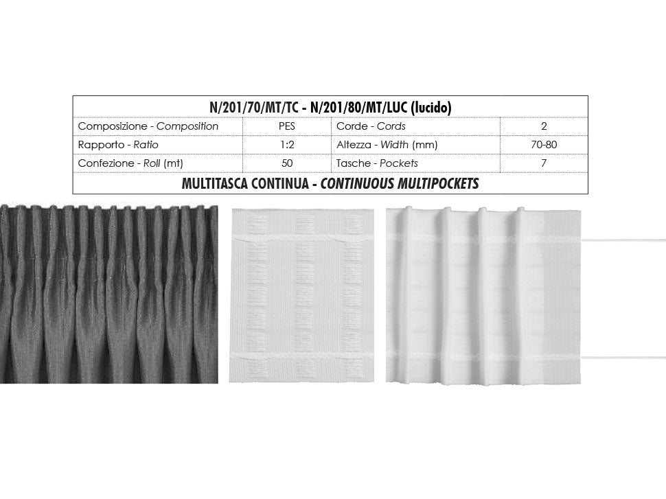 Les rubans fronceurs sont l'accessoire idéal et indispensable pour donner une touche spéciale à tout type de rideau, il est donc essentiel de choisir le bon ruban. Il existe de nombreux modèles sur le marché, tous avec la même fonction et la même méthode d'application mais chacun adapté à la création d'un type de curling différent. Le ruban le plus connu et le plus utilisé est certainement le ruban multi-poches: il est possible d'insérer les crochets dans les poches dans plusieurs positions. C'est un ruban en polyester, il ressemble à un ruban blanc avec des poches où insérer les crochets spéciaux et a deux fils à tirer pour le curling. Facile à coudre, parfait pour créer des rideaux design dans n'importe quelle pièce de la maison, vous pouvez utiliser sur tous types de tissus légers, moyens et épais. Pour obtenir le curling sur le rideau, il suffit d'étaler et de coudre le ruban sur le bord supérieur du rideau, le rapport étendu à frisé est de 2:1, soit deux mètres de rideau tendu couvrant un mètre de fenêtre après le curling. Cette mesure est indicative car plus les fils sont tirés, plus le frisage obtenu est importante. Le ruban est conditionné en rouleaux de 50 mètres, facile à utiliser car bien résiné et rigide, il peut être lavé en machine à 40 degrés centigrades (40 °C) et repassé sans problème. Il reste inchangé au fil du temps. Il est disponible en version blanche ou transparente (pour les rideaux plus légers comme l'organza) et avec trois cordes (pour les rideaux plus lourds) dans les hauteurs 65 mm, 75 mm, 80 mm, 90 mm et 100 mm. C'est la version blanche de 70 mm de hauteur.