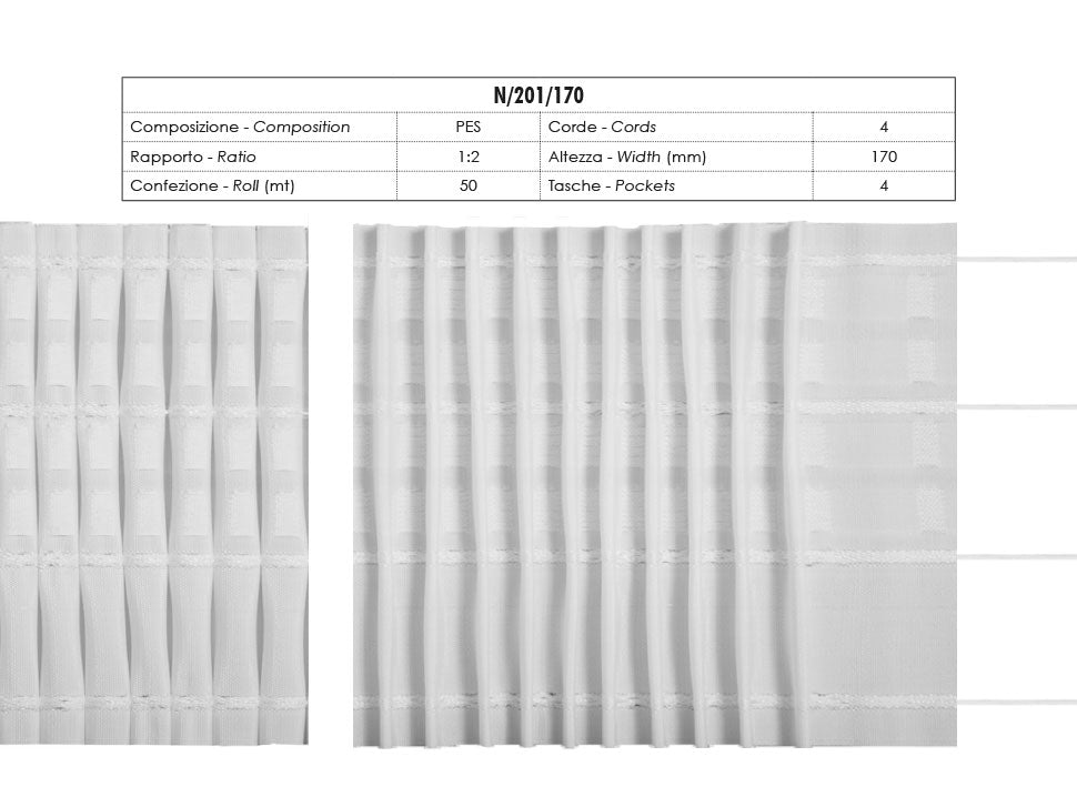 Les rubans fronceurs sont l’accessoire idéal et fondamental pour donner une touche particulière à chaque type de rideau, c’est pourquoi il est essentiel de choisir le bon ruban. De nombreux modèles sont disponibles sur le marché, tous avec la même fonction et la même méthode d’application, mais chacun est adapté pour réaliser un type de frisage différent. Le ruban sans poches sert à renforcer le bord supérieur de votre tente. Facile à coudre, parfait pour créer des rideaux design dans chaque pièce de la maison, vous pouvez l’utiliser sur tous les types de tissu léger, moyen et lourd. Le ruban est de 170 mm de haut, conditionnée en rouleaux de 50 mètres, facile à utiliser car bien résineuse et rigide, on peut laver en machine à 40 degrés centigrades (40 degrés C) et repasser sans problème. Il reste inchangé dans le temps. Il est disponible en version blanche et transparente (pour les rideaux plus légers comme l’organza). Ici est présentée la version blanche de 170mm pour des frisures très hautes.